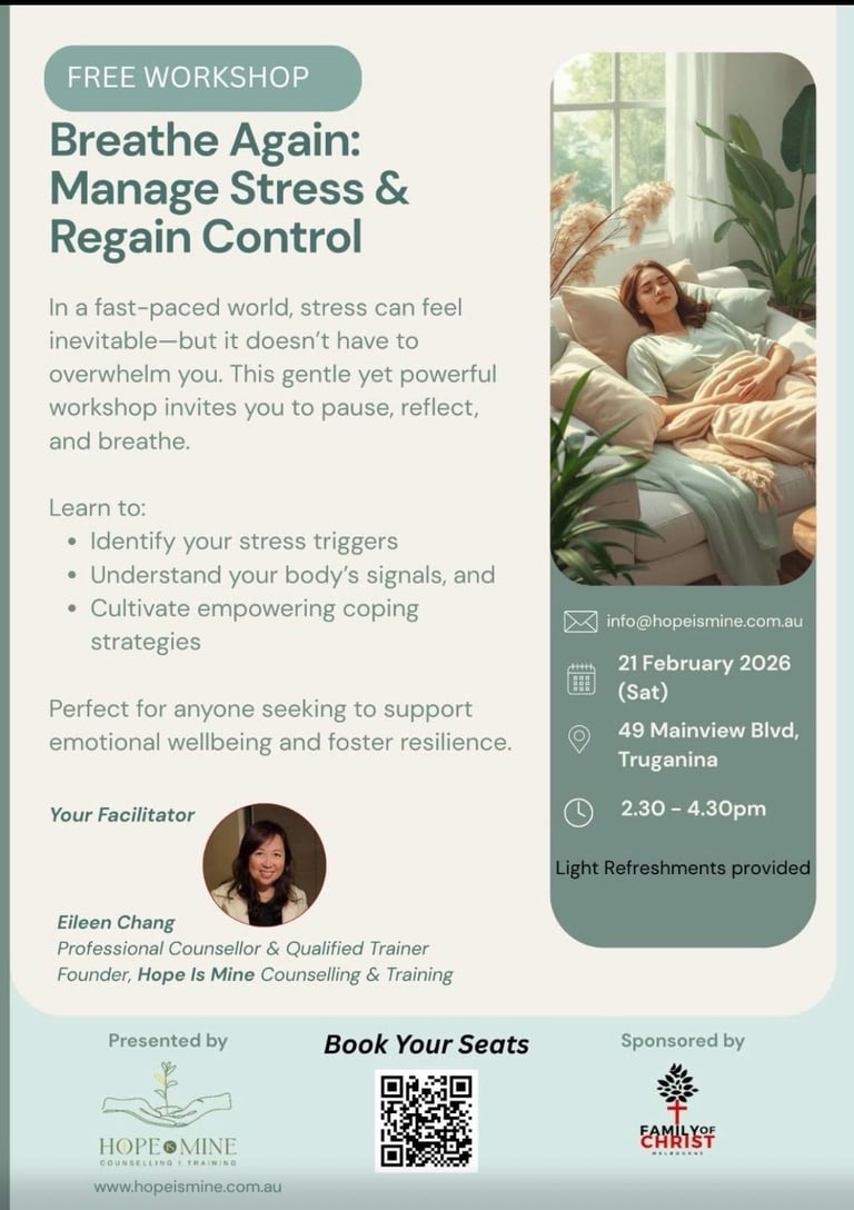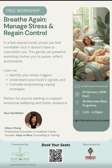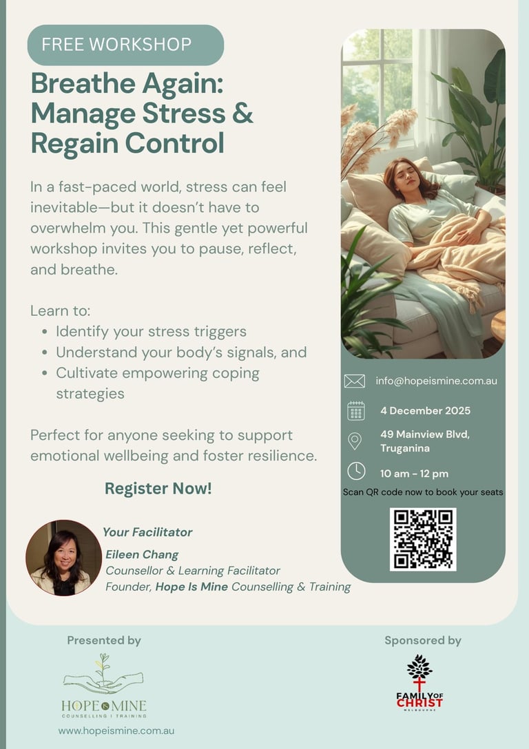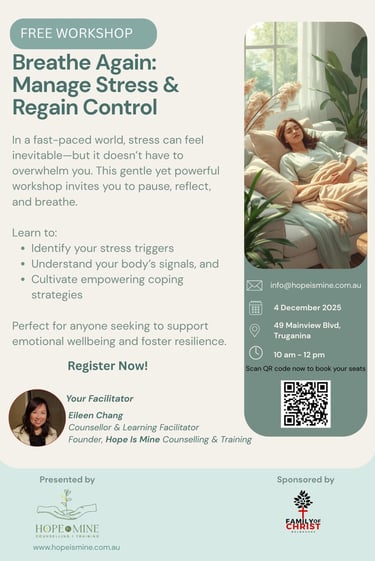 We offer tailored and customised training workshops on mental health well-being and stress/anxiety management for individuals, families and church groups to thrive.